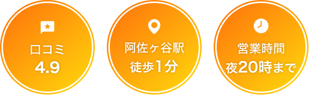 阿佐ヶ谷駅北口を出て左に進んで1分ほどです。また、お待たせする事がないよう完全予約制を採用しております。